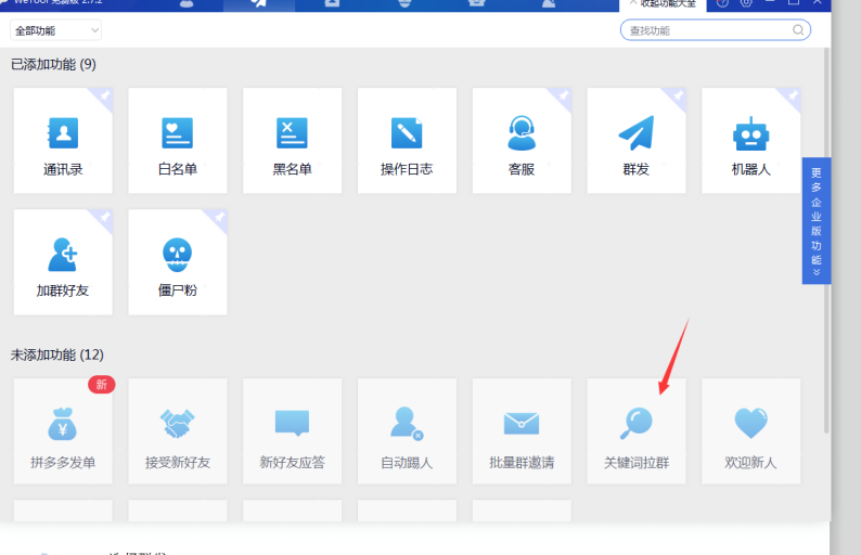 打开软件:点开功能大全 选择关键词拉群 然后添加到顶部导航栏
