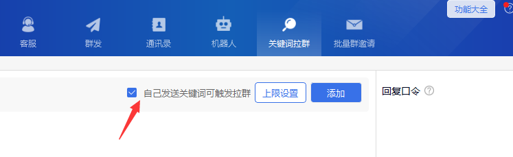第二步 勾选自己发送关键词可触发拉群,然后点击后面的添加