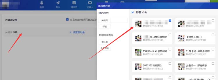 点击添加之后 后面输入关键词,自己设置,可以是520 888 999 都可以 后面选择要进的群(这个群你要提前建好)