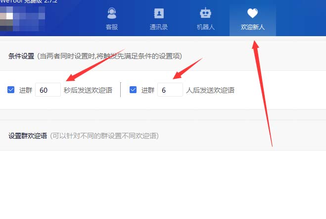 进群时间,这里自己设置。我当初设置的是10秒钟,进群人数达到3人以上 发送欢迎词,如果你的好友很多,你可以帮时间设置少一点,3-5秒都可以,进群人数设置10人左右,如果好友不多,和我一样的设置即可。