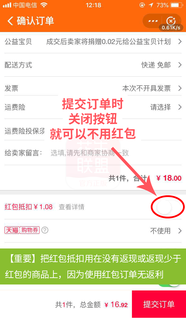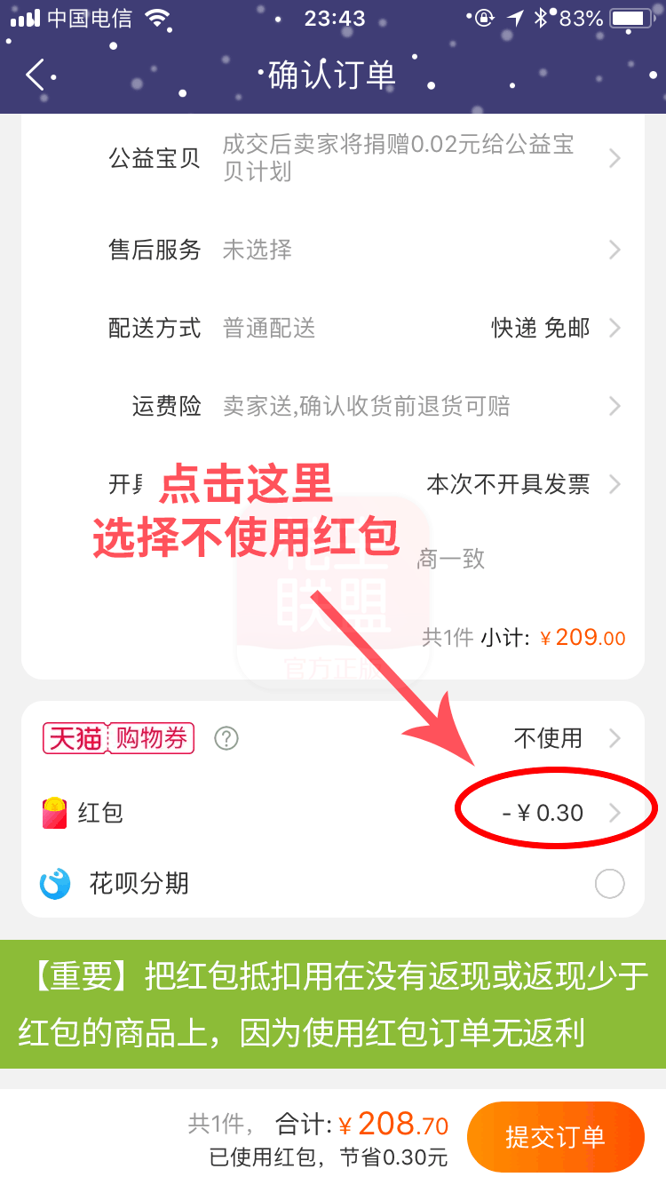使用淘宝红包会导致整笔订单无返利,最好的情况也是返利减半。