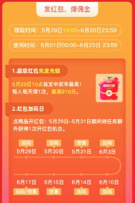 5月28号晚上预告第二天早上10点可以领618超级洪苞,发一波洪苞雨,注意洪苞上面要配上文字提醒;